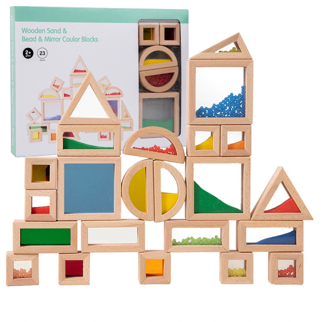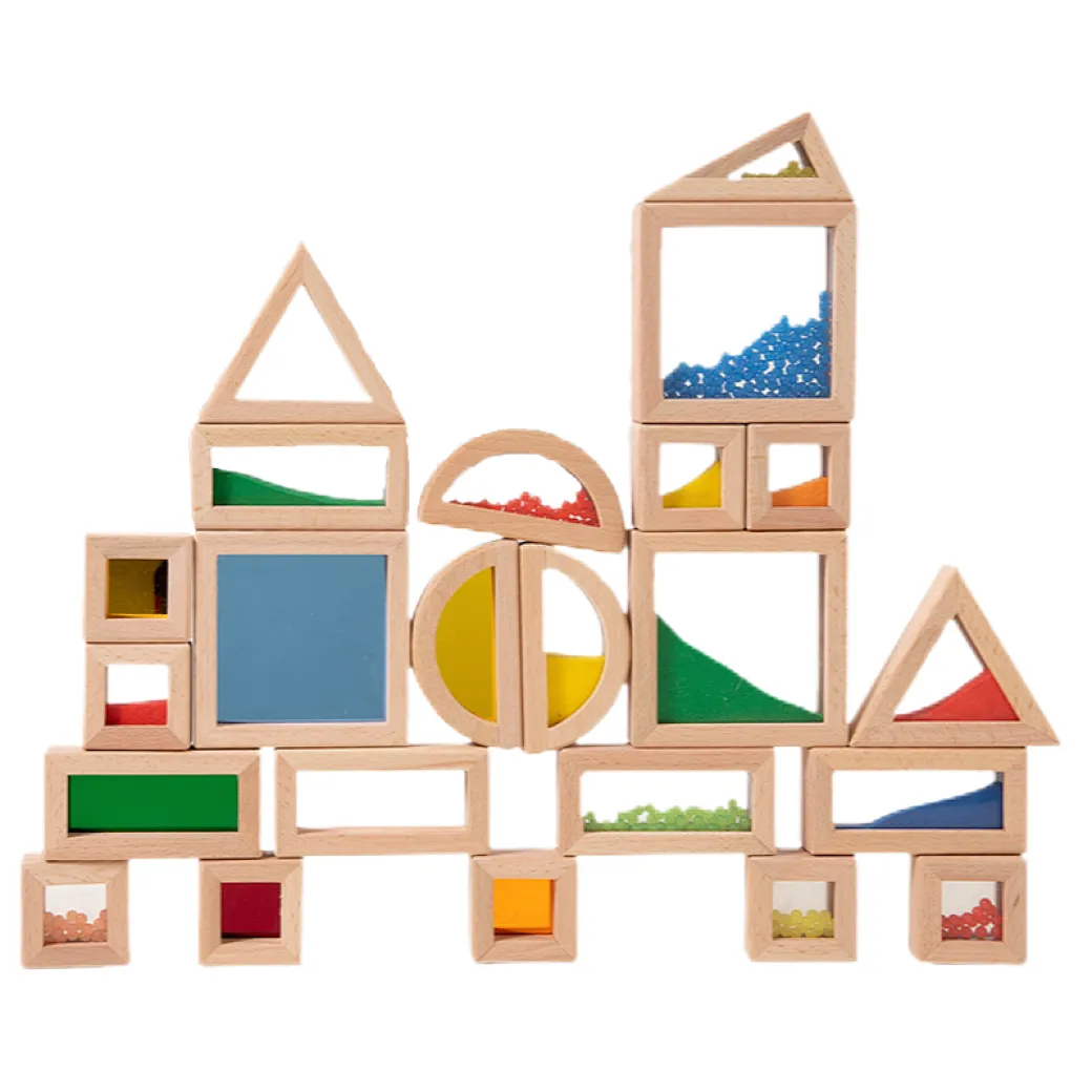 A set of smooth wooden building blocks with crystal coloured marbles embedded in them.