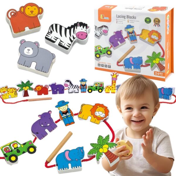 Ideal for using in story-telling, each set includes 12 wooden blocks and one lace. Each block is painted on both sides and the lace is connected with a small wooden bar which is easy for small hands to use.