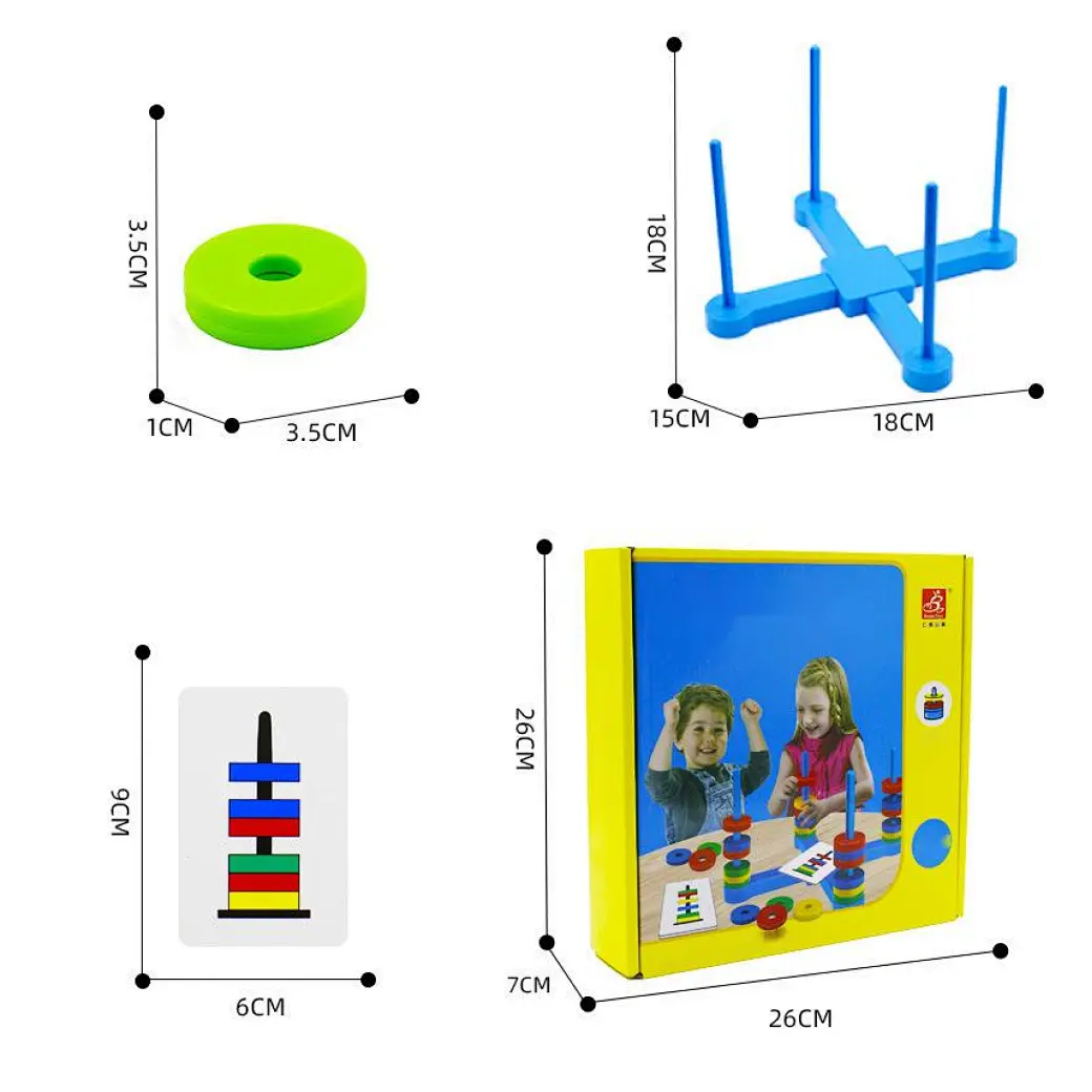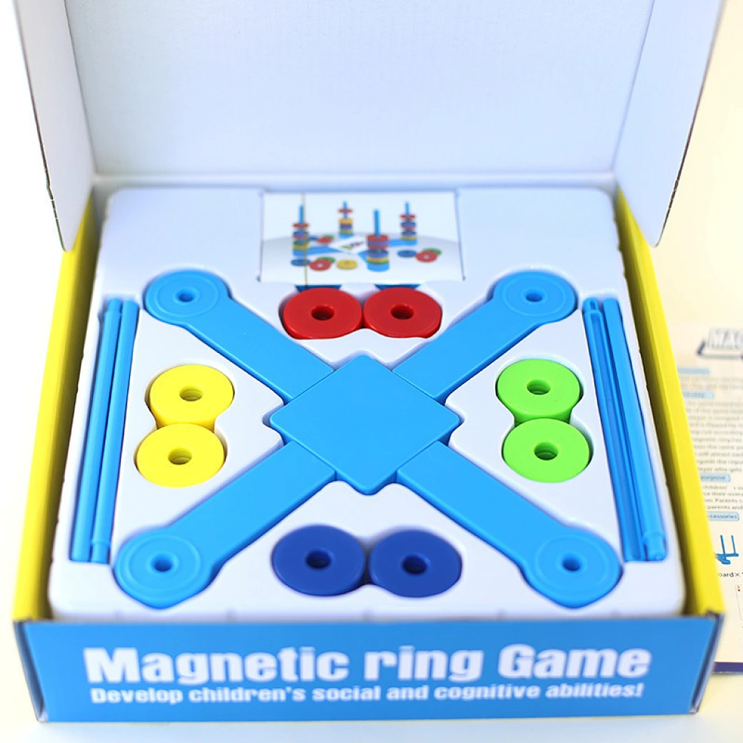 The game includes magnetic rings and matching cards that help children learn to recognize shapes, colors and develop problem-solving skills.