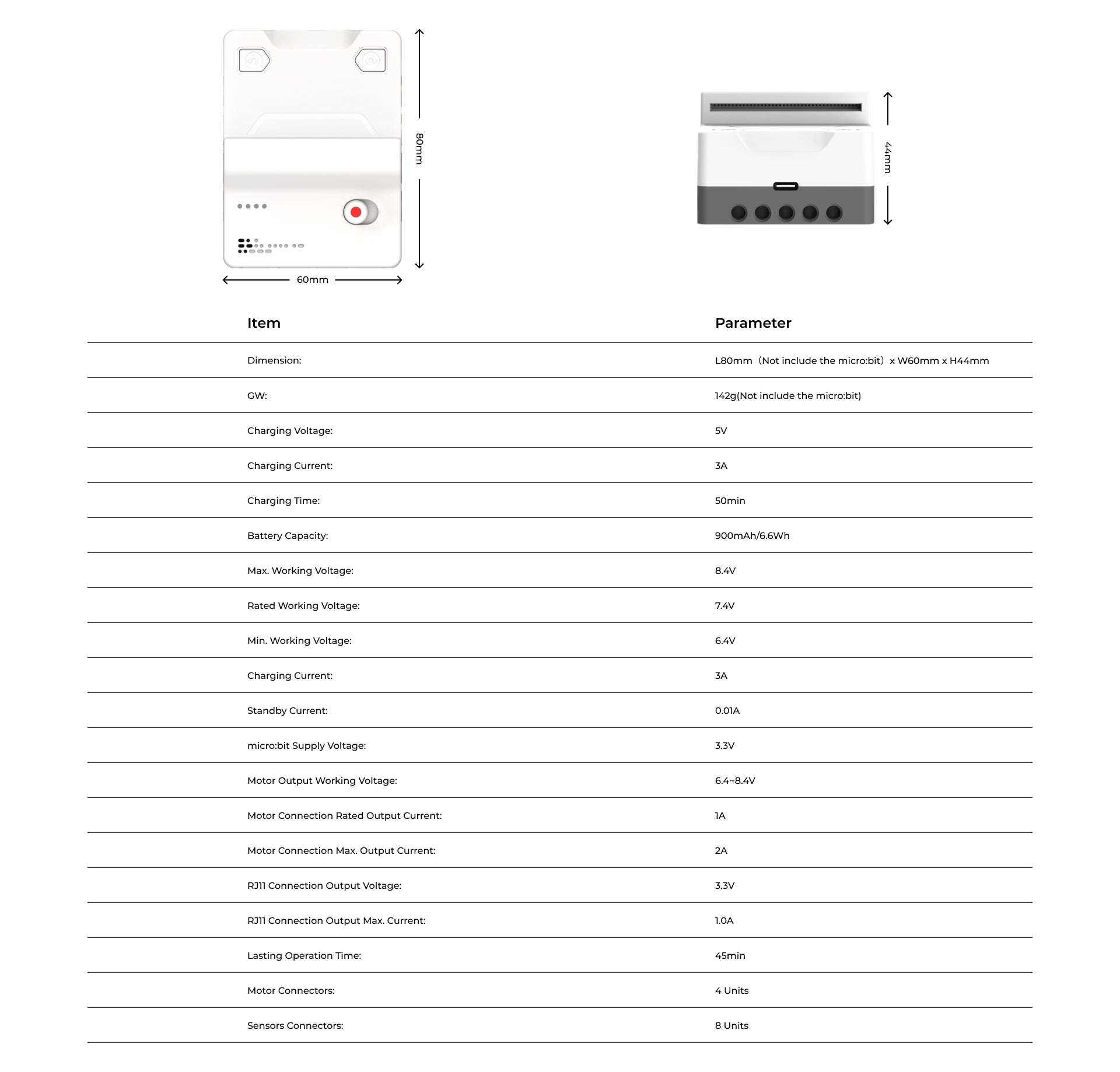 It not only integrates two convenient motor control buttons and a 4-way motor driver, but also comes with an 8-way sensor expansion port, providing students with a versatile platform for experimentation and exploration. These motor control buttons allow direct control of the motor’s direction of rotation without connecting the micro:bit, increasing flexibility of operation. All interfaces use RJ11 connectors with a dud-proof, anti-reverse plug design to ensure fast and accurate connections.