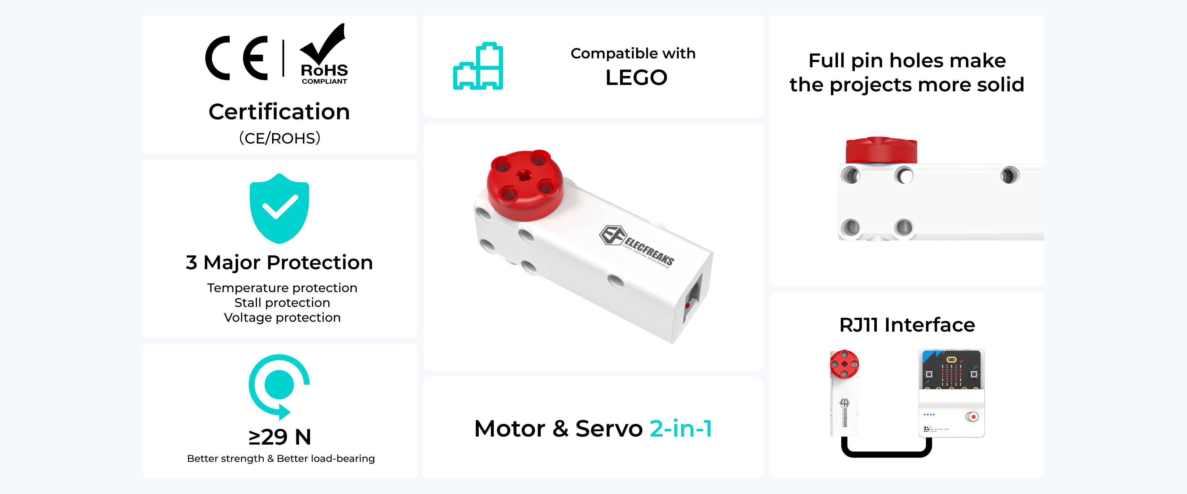 It uses ELECFREAKS’ unique RJ11 interface, which is more suitable for kids.