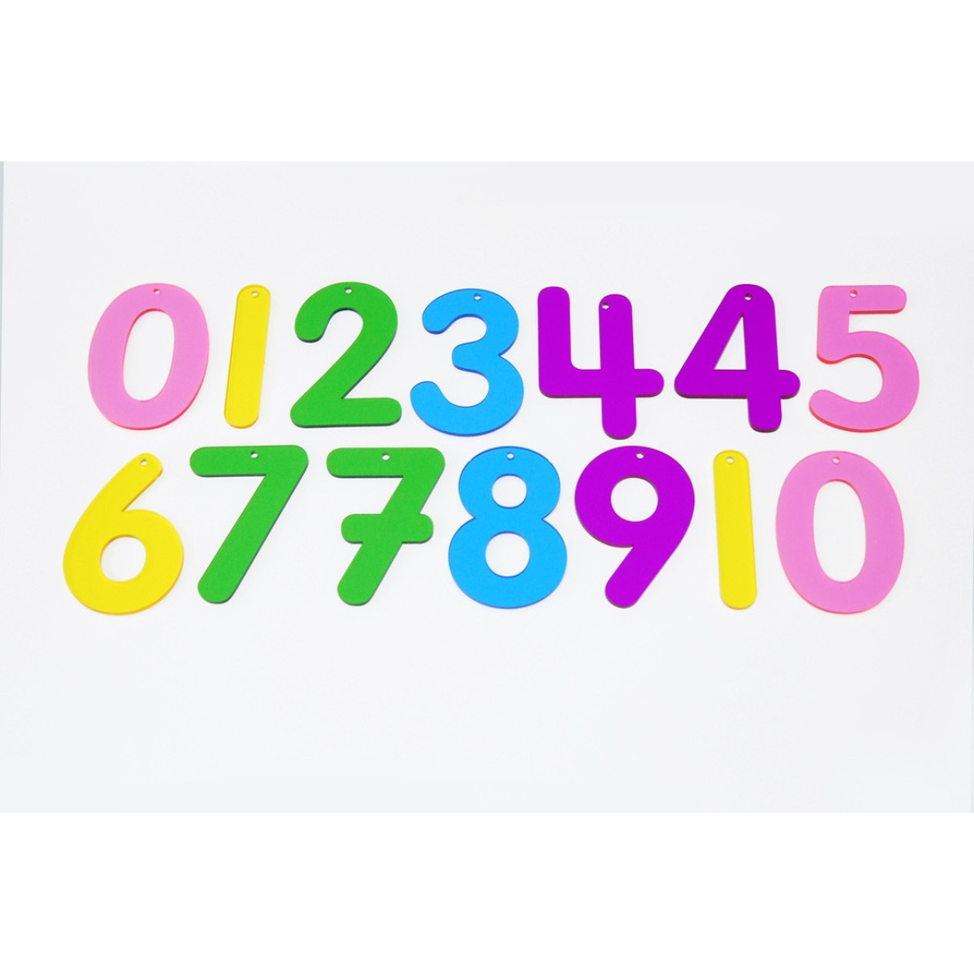Set of 14 numbers from 0 to 9 made from colourful clear 3mm acrylic. The set includes two styles of the numbers 4 and 7, with an additional 1 & 0. They are ideal for use on a light panel to encourage numeral recognition. Numbers come with a 2.5mm hole at the top balance point so they can be strung up or pinned to a notice board.