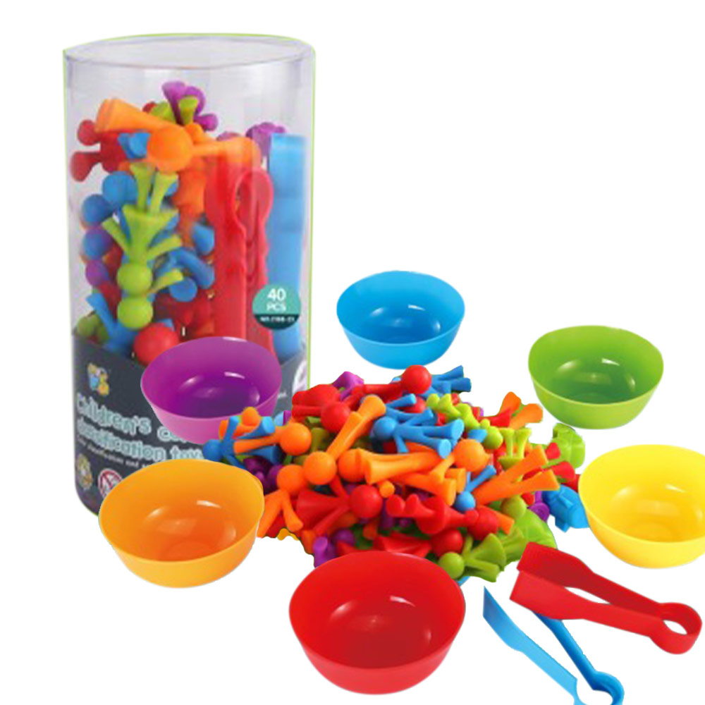Το σετ περιλαμβάνει 40 πλαστικά κομμάτια σε ζωηρά χρώματα, μικρά μπολ ταξινόμησης και ειδικές λαβίδες για εύκολο πιάσιμο και μεταφορά των αντικειμένων.