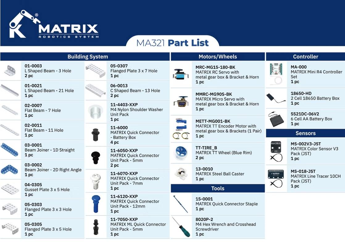 Το MA321 Matrix R4 MissionGo Set είναι ένα αγωνιστικού επιπέδου εκπαιδευτικό σετ ρομποτικής για WRO RoboMission, σχεδιασμένο για μέγιστη ακρίβεια, επαναληψιμότητα και αξιόπιστη απόδοση σε κάθε αποστολή.