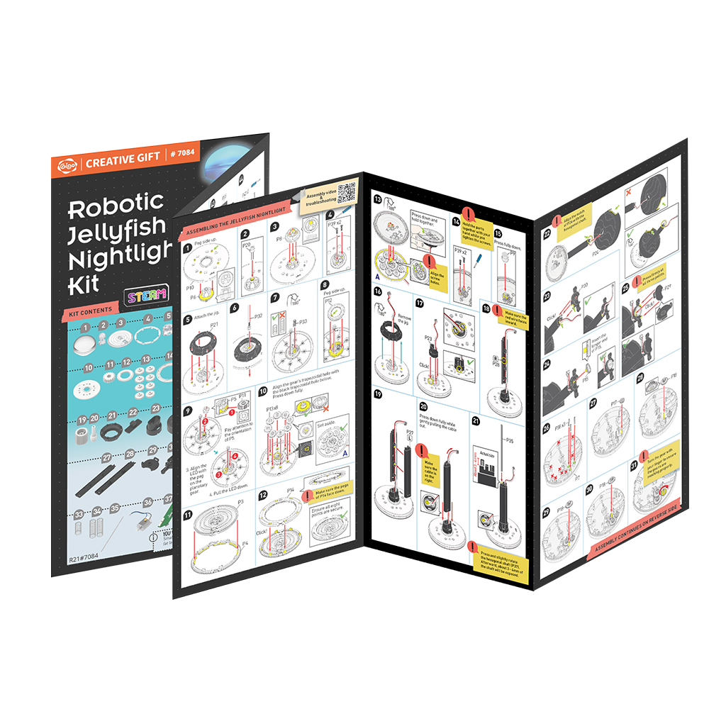 Το Robotic Jellyfish Nightlight Kit είναι ένα εκπαιδευτικό σετ κατασκευής που επιτρέπει σε παιδιά (8+ ετών) να συναρμολογήσουν ένα εντυπωσιακό φωτιστικό νυκτός σε σχήμα μέδουσας, με ρεαλιστική κίνηση και εναλλασσόμενο φωτισμό LED.